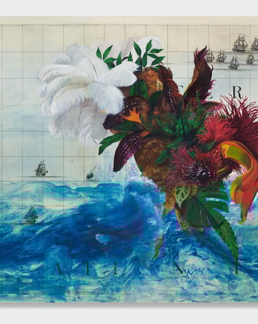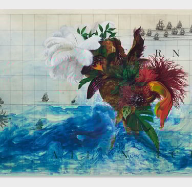 Firelei Báez's practice is one of radical revision. Across painting, drawing, and installation, she intervenes in the archives of colonial history—maps, charts, botanical illustrations—overlaying them with densely patterned figures and forms drawn from Afro-Caribbean mythology, folklore, and the imagined futures of the diaspora. Born in Santiago de los Caballeros, Dominican Republic, in 1980, and based in New York, Báez constructs visual spaces where what has been suppressed or forgotten can coexist with what might yet be. Her work proposes that history is not fixed but fluid, always available for reexamination and reinvention.