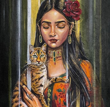 A girl holds a Savannah cat — a symbol of courage hidden beneath silence. The work speaks to inner strength and the safety found in quiet companionship.