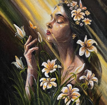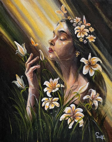 A parallel concern emerges in Where the Lilies Breathe, also completed in 2025. The work addresses itself to questions of how women are regarded and treated. Sheriff's articulation is deliberate: not control, not confinement, but rather the cultivation of "a safe heavenly environment in this world." The painting proposes sanctuary as an active, intentional condition—one that recognizes purity of spirit not as fragility but as something warranting protection. Both works, modest in scale at fourteen by eighteen inches, achieve an intimacy appropriate to their subjects.