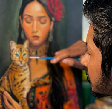 The paintings of Saahil Sheriff operate in the space between visibility and concealment. Working in acrylic on canvas from his base in Asia, Sheriff peoples his compositions with fictional characters who function as vessels for philosophical inquiry. His practice, as he describes it, seeks to "showcase the strength and beauty of people through canvas," yet the work is less concerned with surface representation than with what remains unseen.